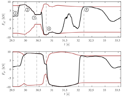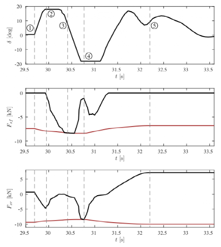 到时分③时,Fxf已挨近其最小值,只为Fyf留下少许力容量。此时,车辆一经足以避开第一个妨碍物,这将许诺操纵器给前轴供给必然的制动时分。因为后轴需求巨额横向力来安闲和转弯车辆,故大约正在时分③时,操纵器无法制动后轴。到了时分④时,情状发作了逆转:车辆需求向右变道并爆发较大的反向力以避免偏离道道,是以将前制动力消重到简直为零。同时,有一段短暂的时分,用于安闲的后轮胎横向力从正转折为负;操纵器欺骗这段短暂的时分来制动后轴。