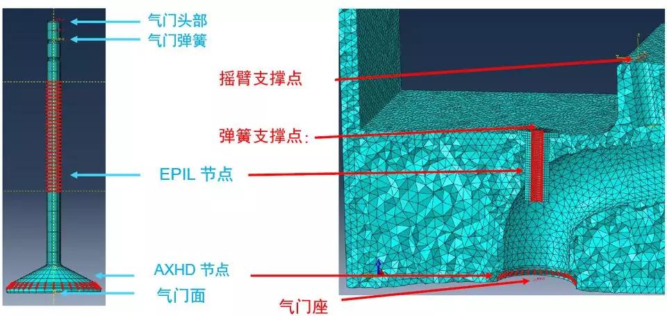 正在缩减的历程中,缸盖中的气门导管与气门座圈按EHD剖判条件保存外观主节点。气门保存杆身、气门阀面、气门头部、气门弹簧连结点以及施加缸压载荷的气门阀面节点。完全网格统治睹图6。之后通过正在EPU主界面创修前文所述的AXHD以及EPIL连结副将气门与导管及座圈之间连结,实现修模。