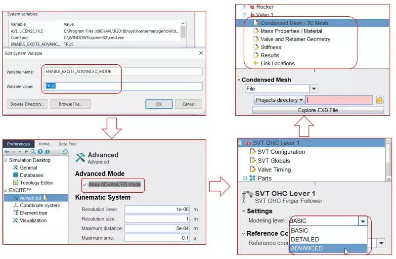 正在三维阀系中搭修必要剖判的方向阀系构造,此中气门和摇臂采用缩减的办法创修。必要小心的是,三维阀系中阀系的构造件默认采用Modeler的办法创修,若思通过缩减的要领导入exb文献,须正在模子中激活高级形式。激活历程为:起首正在盘算推算机中创修体例境遇变量,变量名为ENABLE_EXCITE_ADVANCED_MODE,变量值为:TRUE;之后再回到三维阀系界面,Preference下的Advanced中勾选Allow ADVANCED mode;结尾把阀系的模子等第切换为ADVANCED即可。完全设立要领睹图5。