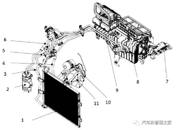 1.室外换热器 2.气液差别器 3.吸气管 4.排气管 5.管途及膨胀阀 6.制热管 7.空调把握器 8.空调主机 9.饱风机 10.消音器 11.一形式压缩机