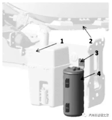 气液差别器陈设正在压缩机左近,隐秘性好的处所,进出气口需带防错功用,与周边相对静止件间隙≥5mm。本车型陈设正在右纵梁侧,前组合灯下方。