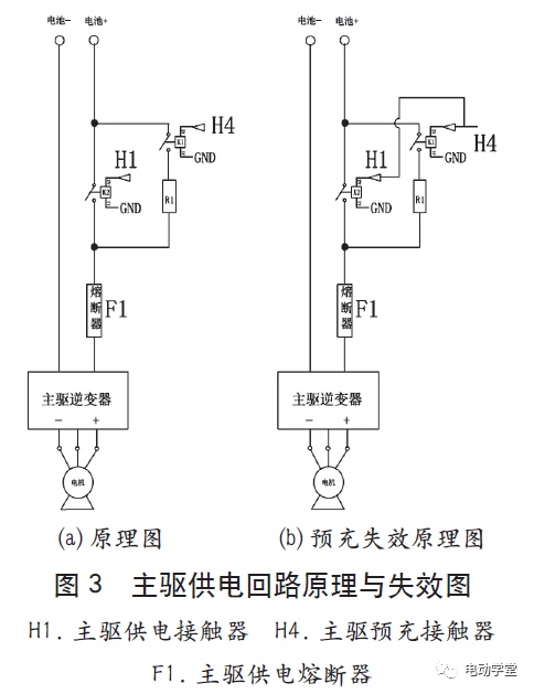 经历排查,最终确定主驱供电回途接触器和主驱预充回途接触器的节制信号线粘连,导致预充回途短途,等效于无预充回途,如图3(b) 所示,电池电压直接加正在主驱回途,变成大电流袭击,是以烧主驱配电回途接触器及熔断器。
