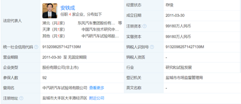 按照企业新闻显示,中汽试验场创设于2011年3月30日,法定代表人安铁成,该公司由中国汽车手艺探究中央有限公司(下称“中汽中央”)投资控股,江苏悦达集团和江苏大丰海港控股集团参股,个中中汽中央持股51%,后两者差异持股39%和10%。此次登岸创业板的中汽试验场,是上述中汽中央部属盐城分公司。