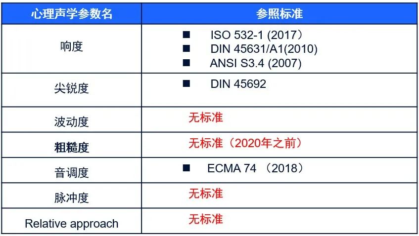 为了各个心境声学参数具有可比性,可能参照极少国际准绳或国家准绳。此中,响度可参照ISO 532-1、DIN 45631/A1和ANSI S3.4,锐利度可参照DIN的准绳,声调度可参照ECMA准绳,睹下表。