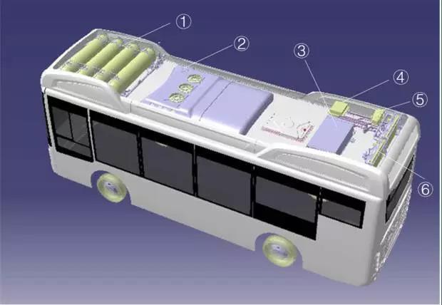 燃料电池汽车的碰撞平安苛重包罗储氢体例、氢气管道、燃料电池堆、百般阀门、衔接头号合节部件正在发作碰撞时不行遭遇捣鬼。目前,对燃料电池氢平安的碰撞防护计划除了合节零部件具有防撞才智外,苛重通过名望摆设、固定安装扞卫和惯性开合监控碰撞并与整车监控体例联动,主动断电、主动紧闭阀门等手段来避免灾难的发作。比如,燃料电池羼杂动力客车的高压储氢瓶大凡放正在车辆前置顶部,燃料电池模块放正在客车后置顶部,动力电池安顿于地板下方。前置的储氢瓶,通过车顶部的管道与车辆后部的燃料电池体例衔接,正在发作透露时,氢气可能疾捷排放到大气中去。燃料电池模块对车身布局根基无影响,而动力电池安顿正在地板下方,则分身了车身重心低平稳性好,如图2-2所示。