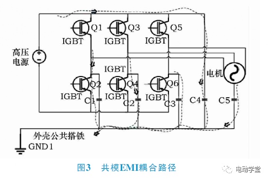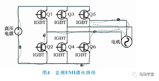 新能源电动汽车正在举办整车电磁兼容的相干规矩试验时,不管是整车辐射发射测试仍是整车电磁场发射测试,看待新能源电动汽车都有恳求车辆处于行驶状况下举办相干的试验,车内的高压体系正在强电压和大电流的状况下就业时,很容易发作激烈的电磁扰乱。以电驱体系为例,电驱体系的IGBT开闭速率很速,IG-BT的上升沿和降落沿正在100ns到200ns之间,开通和闭断历程中伴跟着较大的电压蜕化和电流蜕化,从而发作激烈的电磁扰乱。如图3所示,高压电池组和线缆对搭铁、开闭器件IG-BT对散热器、电机绕组对机壳等,都市正在全数体系中发作寄生电容,睹图3C1,C2,C3,C4,C5寄生电容,从而造成了共模EMI耦合途途。同时电机体系的开闭器件正在开通和闭断历程中发作的急速电流蜕化与体系中的杂散电感彼此耦合造成了差模EMI扰乱途途,如图4所示;所以新能源电动汽车的电驱动体系通过共模扰乱途途和差模扰乱途途会对外界发作较大的电磁扰乱。
