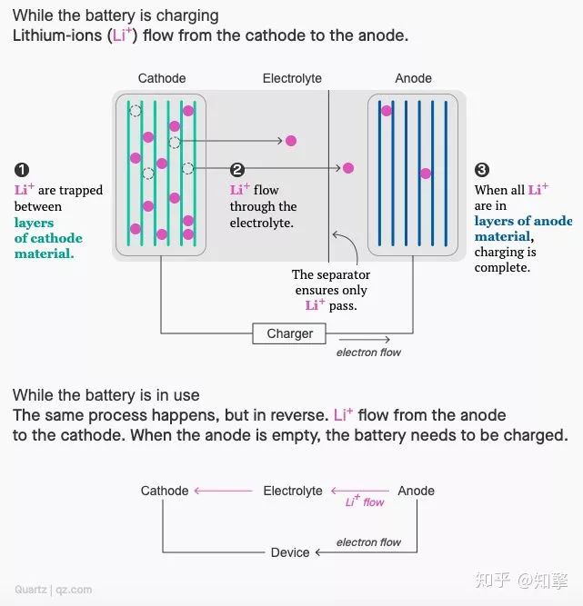 咱们目前最前沿的电池化学是锂离子。大大都专家都应许,正在起码十年或更长的时辰里,没有其他化学物质会作怪锂离子。锂离子电池有两个电极(阴极和阳极),中心有一个分辩器(一种能够传导离子而不是电子的资料,旨正在预防短途),另有一个电解质(往往是液体),使锂离子正在电极之间来回活动。当电池充电时,离子从阴极搬动到阳极;当电池供电时,离子向相反的宗旨搬动。