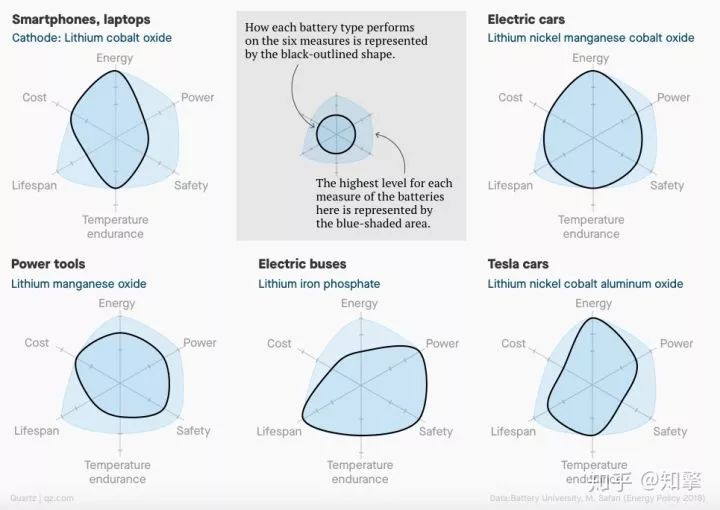 每个电池有两个电极:一个阴极和一个阳极。大大都锂离子电池的阳极是由石墨制成的,但阴极是由种种资料制成的,这取决于电池的用处。下面,您能够看到分别的阴极资料奈何调换电池类型正在六个方面的阐扬。