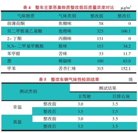 对整改车辆进行“全谱分析+主观气味性评价”,并对复测结果进行分析,整车排名前7位的恶臭物质改善明显,整改车辆常温及高温的气味性评价结果由3.0级提升到3.5级,可满足其企标Q/JQ13128—2019要求,如表4和表5所示。