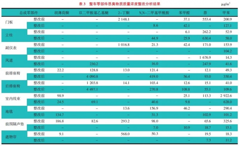 采用改善原材料、工艺及仓储等措施,完成10类零部件整改及全谱数据分析,6类零部件(门板、副仪表、线束、地毯、前围隔声垫、遮物帘)提升明显(如表3所示),针对复测结果进行评估分析后将整改零部件装车。