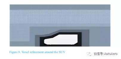 PowerFLOW中的空间离散化发作所谓的晶格,包罗“体素”(立方体体积单位)和“外表”(外表单位天生为体素与外表订交)。本探讨利用的晶格是利用汽车行业领先公司目前采用的最佳实验模板天生的,具有自愿体素尺寸(最小0.5mm)和基于模子尺寸和几何特色的细化区域。发作的最小体素巨细是模子长度的10-3%。晶格的横截面显示了车辆边际的细化地点,如图1所示。流体域中的体素总数约为7000万,而SUV外表的y +值正在15≤y+≤100的规模内因而,墙面效用合用于全盘外表。