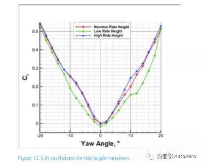 将行驶高度从标称弥补到高对总升力险些没有影响,如图12所示,由于正在两种环境下地面间隙都足以使地面效应受到限定。然而,正在最低行驶高度处,升力显着下降,这归因于车身底部与标称情状比拟的差别滚动特色。