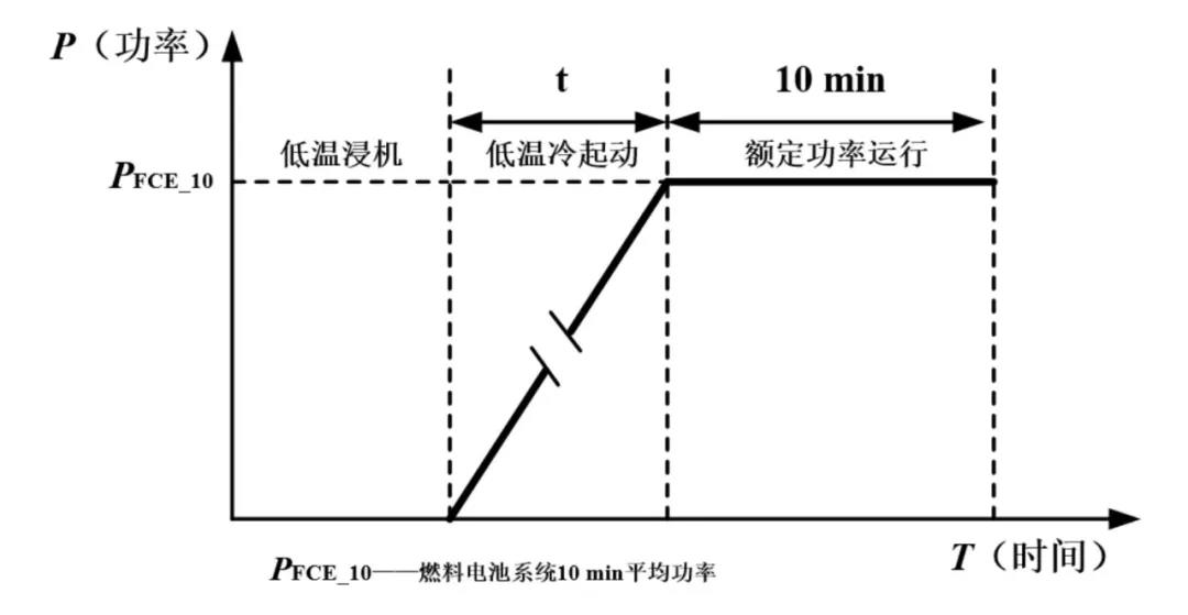 燃料电池编制的低温浸机和试验温度为-30 ℃或更低温度,且有用浸机岁月不小于12 h。浸机进程终结后,向燃料电池编制发送起动和加载指令,加载到创设厂轨则功率后接续太平运转10 min,燃料电池编制的输出功率应永远处于10 min均匀功率的97%~103%之间。记实从测试平台发送起动指令动手至燃料电池编制抵达额定功率的岁月t(如图4所示)等参数。