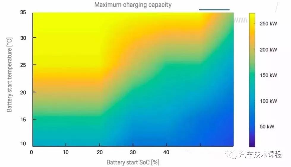 当然不止电池的SOC影响充电功率,气温同样影响,如上图所示电池最佳充电境况温度正在25-35度之间,跟着SOC的增补而低落。