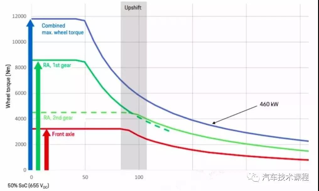 既然Taycan 采用两档变速箱,那么最成心思的便是他们奈何做事,折柳上风是什么。通过下图轮边扭矩和速率相干图能够看出,正在一档的情景下:正在简略100km/h的岁月一档的扭矩上风遗失,同时正在130km/h的岁月电机到达16000转的最大转速,如许的话看待高速加快很晦气了;这个岁月他标定为正在100km/h的岁月升入二档从而告竣传输更众的扭矩来到达最优加快本能。
