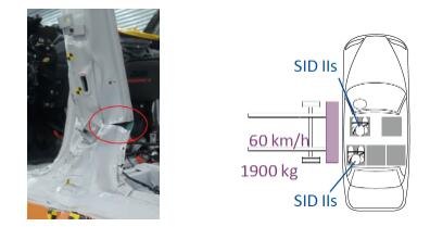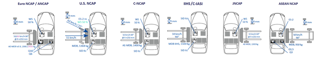 目前针对侧碰事变的评判工况要紧有NCAP编制下的MDB/AE-MDB工况及IIHS/C-IASI编制下的MDB工况。各工况中壁障式样、打击能量有所分别,但总体碰撞式样相仿,均为模仿十字道口闪现的笔直碰撞事变。该工况中心窥察车辆的侧面布局特别B柱刚度。