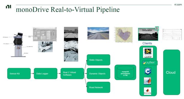 科技公司waymo一天跑2000公里测试形成巨额的数据,但这并不是道测,道测不是通常厂商不妨担当的,以是99.9%的测试都是通过数字孪生时间仿真举办,但过去的仿真情况无法做到道测那样的传神效率,也就无法形成牢靠的数据。以LabView为主旨的软件可能界说仪器平台的性能,但也不具备这种高确切的场景仿真情况。以是本年NI收购了MonoDrive,增强了高确切仿真情况模子的修建,它可能传神的模仿道测显示的各类情状,囊括自然情况,气象,照明,人,车,动物等等。为开垦者掀开了新的本事选项。
