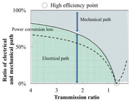 正在一个功率分流式的变速器中,输入功率途经呆板途途和电途途被传达至输出轴。比如,图5闪现了正在输入功率分流形式下,输入功率正在呆板途途和电途途之间的分流比,这一比率跟着变速器的传动比而变动。当功率被分流至电途途,机电之间的能量转换将爆发两次。这就导致了功率的吃亏。这一吃亏也是变速器效果低下的紧要原由。图5闪现了电途途的功率吃亏,仅研商了功率转换带来的吃亏。当MG1转速为0时,电途途的功率损耗为0。这一点便是一个高效果点(图中圆圈局部)。正在变速器增速速比鸿沟内,以高效点为基准,功率正在MG1和MG2之间轮回。