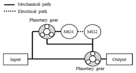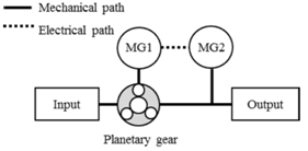 正在输出功率分流形式中,输入轴及一个电动机/发电机配合与差动机构的某一局部相连,三者转速一样。差动机构的其他两个局部诀别与另一个电动机/发电机以及输出轴相连。(图3)