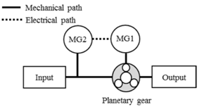 一台采用功率分流形式的混动变速器有一个差动机构(行星齿轮)、两台电动机/发电机(与差速机构的转动局部相连)、一个输入轴以及一个输出轴。变速器能够正在以下三种形式下管事:输入功率分流、输出功率分流、复合功率分流。正在输入功率分流形式中,输出轴及一个电动机/发电机配合与差动机构的某一局部相连,三者转速一样。差动机构的其他两个局部诀别与另一个电动机/发电机以及输入轴相连。(图2)