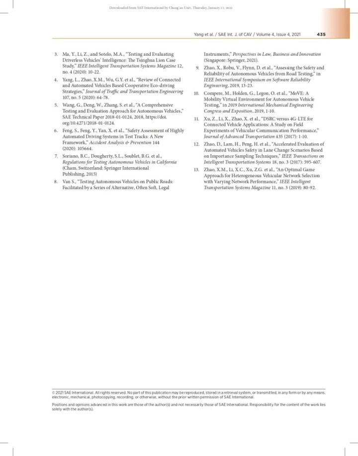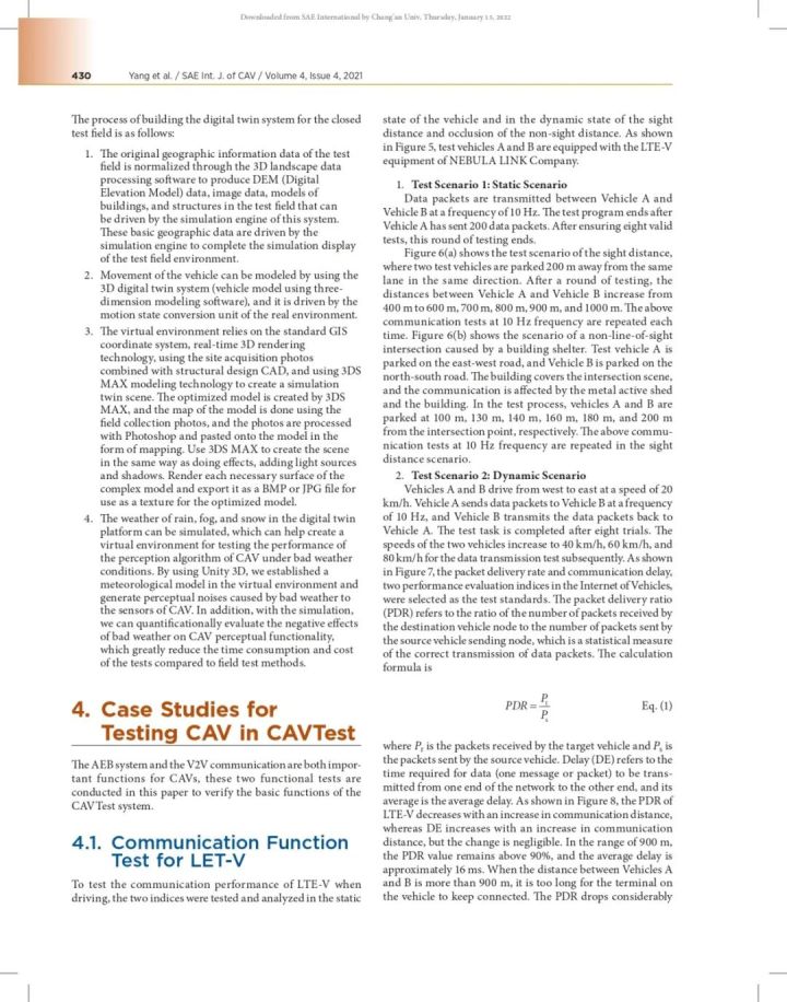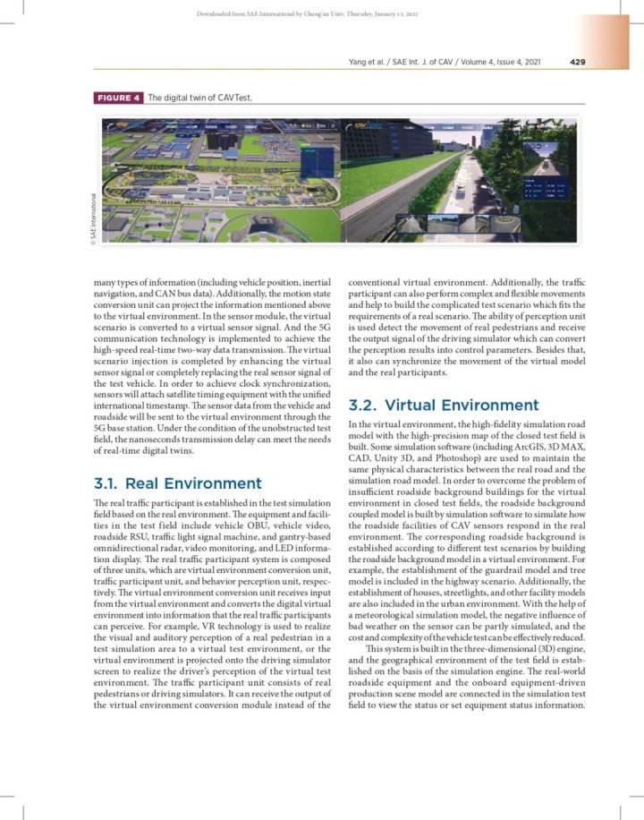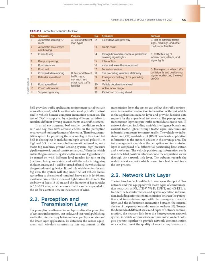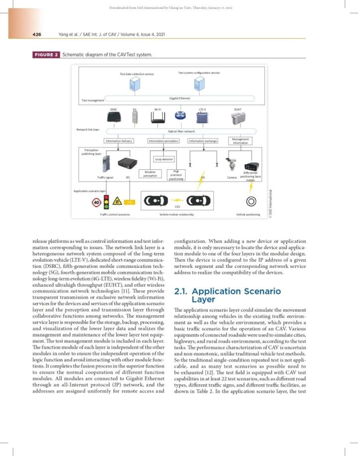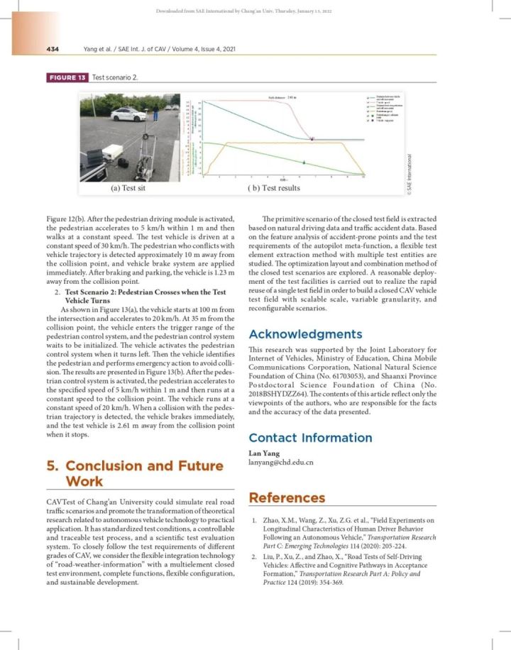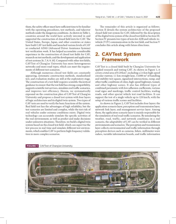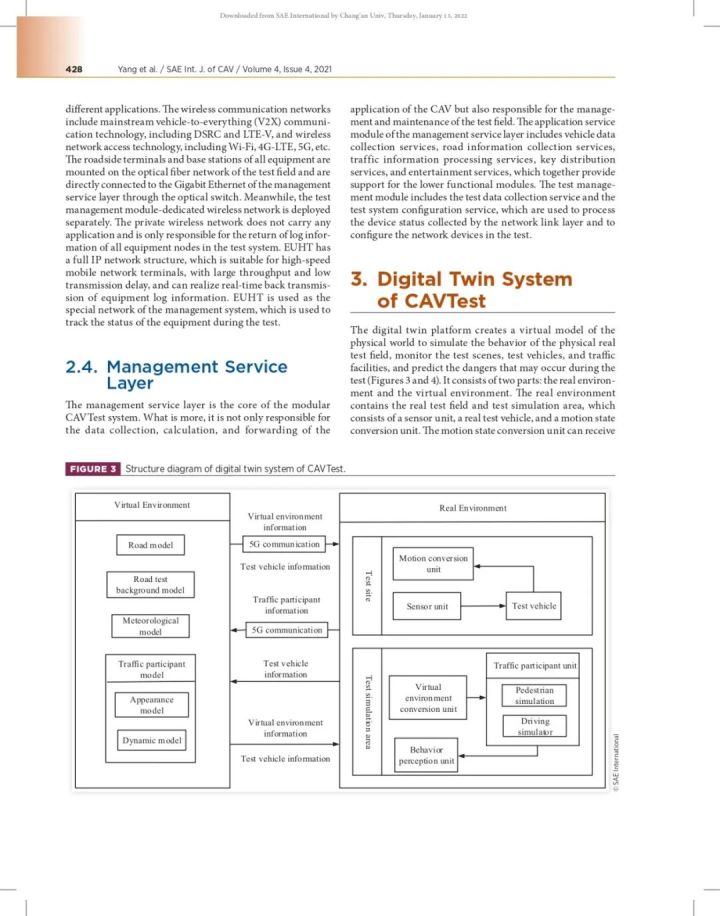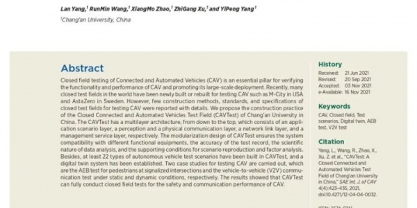 关闭场合测试是验证CAV成效和职能以及鼓舞其大领域安置的主要支柱。近年来,寰宇各地新修或改修了很众用于测试CAV的关闭试验场,如美国的M-City和瑞典的AstaZero。然而,合于CAV关闭试验场的创设步骤、圭臬和模范很少有周到的报道。因而,本体裁例地先容了中国长安大学关闭式车联网与智能汽车试验场(CAVTest)的编制架构和创设推行。CAVTest采用众层架构,自下而上差别由运用场景层、感知层、物理通讯层、汇集链接层和统治任职层构成。CAVTest的模块化安排确保了体例对差异成效兴办的兼容性、测试记载的切确性、数据理会的科学性,以及接济场景再现和测试数据搜集理会的软硬件条目,另外CAVTest还扶植了起码22种带罕睹字孪生成效的CAV测试场景。本文结果基于CAVTest发展了两个CAVs测试案例的斟酌,差别是:1)信号交叉口的行人防碰撞AEB测试;2)静态和运动条目下的车-车(V2V)通讯测试。斟酌结果注明:CAVTest可能正在关闭境况环中对CAV的平安性和通讯牢靠性举行充溢测试。