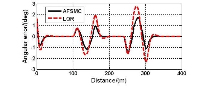 图9显示了横向偏差的反映结果,当主动驾驶车辆进入车道变换历程时,所提出的AFSMC掌握方式和LQR方式的最大横向偏差区分为±0.1m和±0.4m。角度偏差的反映结果如图10所示,可能展现所提出的掌握方式和LQR掌握方式的稳态角度偏差是有界的,它们的最大值区分小于1.5°和3°。