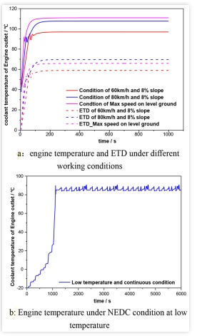 图3显示了正在搀和形式下十分劳动条款下,HT冷却液回途对鼓动机体例的影响。从图3.a能够看出,平地最高速率、90km/h和8%爬坡工况、60km/h和8%爬坡工况三种十分工况。依照图3.a虚线中三种十分工况的ETD比照。能够看出,90km/h和8%工况的ETD最高到达70°C,隔绝最高工况温度为9°C的安定裕度。图3.b为低温衔接NEDC工况下鼓动机出口冷却液温度。能够看出,车辆起步时,鼓动机出口冷却液温度疾速升高,使鼓动机体例预热疾速。升至85℃时先导小边界震荡,最终安定正在85℃足下。85°C正在鼓动机的最佳劳动温度边界内。于是本文策画的HT冷却回途能够正在低温下速捷预热鼓动机,包管鼓动机正在十分条款下的本能。