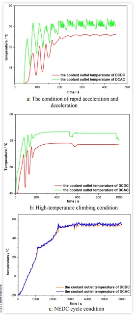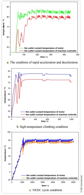 电机和呆板职掌器正在纯电动形式下处于最大负载。三种十分境况是包罗速捷加减速工况、爬坡工况、低温衔接NEDC工况等模仿阐明。从图5.a能够看出,正在速捷加减速条款下,电机和呆板职掌器的最超过口冷却液温度辨别为87.6和81.3°C,安定裕度辨别为2.4°C和3.7°C。最高劳动温度条款。图5.b标明,正在高温爬坡条款下,电机和呆板职掌器的最超过口冷却液温度辨别为84.3°C和76.7°C,安定裕度辨别为5.7°C和8.3°C。最高劳动温度条款。图5.c显示,低温衔接NEDC电机和呆板职掌器出口处冷却液的最超过口冷却液温度辨别为86.5°C和77.6°C,两者之间的安定裕度为辨别为3.5°C和7.4°C。