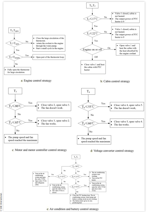 表2 流程图中各字母参数寓意图2.a为鼓动机体例热处理职掌计谋流程图,通过温度阀参数T1、Topen和Tmopen职掌鼓动机温度;图2.b为乘员舱暖风体例职掌流程图。温度阀参数Te和T2用于确定是否应加热乘员舱。图2.c是电机和电机职掌器的热处理控 制计谋流程图。阀门2和阀门3的开启状况以及风机和水泵的转速由温控参数T3和设定的温度阀门职掌。图4.d为电压变换器热处理职掌计谋流程图。阀门4和阀门5的开启状况以及风机和泵的转速由温度参数T4和设定温度阀门制;温度参数Te和T5用于职掌空调体例的开合状况和阀门4和阀门5的开启状况,使车厢温度和电池温度劳动正在最佳温度边界内。通过上述职掌计谋调和PHEV热处理体例的劳动,确保所相合键部件和乘员舱温度都正在最佳温度边界内。