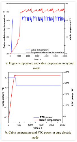 图4阐明了纯电动和搀和动力形式下的车厢温度转移。从图4.a能够看出,正在搀和动力条款下,舱室温度正在先导的500s疾速上升,紧要由PTC辅助加热装备加热。然后跟着鼓动机出口冷却液温度的升高,PTC加热器合上,机舱由鼓动机余热加热,机舱温度维系正在22°C。图4.b为纯电动形式下的车厢温度和PTC功率弧线秒内加热乘员舱,并维系乘员舱温度安定正在22°C。但PTC功率正在冷启动阶段到达3.5kW,然后安定正在2.8kW以坚持乘员舱温度。如图4所示,乘员舱暖风体例采用高温回途余热和PTC辅助加热式样,既包管了乘员舱体例正在低温处境下的速捷预热,又到达了节能的目标。降低PHEV的边界。