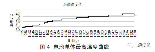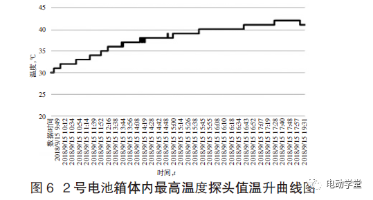 a.该新平台车正在境况温度为34℃、满载模仿工况道试,行驶流程中单体温度最越过现正在后置电池2号箱,最高温度为40℃。b.该新平台车正在SOC为60%起补电流程中,最高单体温度涌现正在后置电池2号箱,最高温度为42℃。