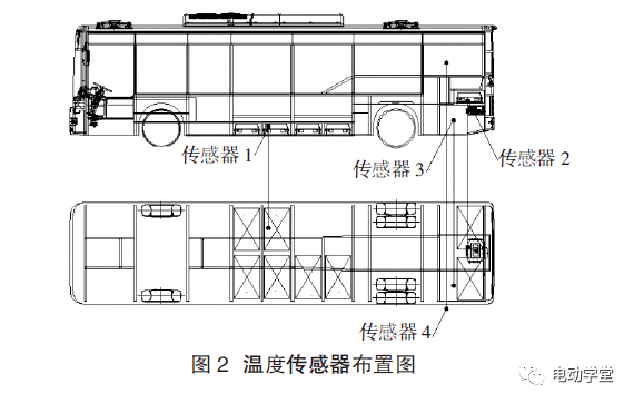 测试境况温度为34℃,车辆形态为满载(18t),都市工况下运营,均匀车速约为15km/h。模仿都市客车运营后补电,整车SOC从100%降至60%时举行充电,充电电流为110A摆布。温度传感器陈设如图2所示,传感器1陈设正在底置电池舱,传感器2陈设正在后置电池舱,传感器3陈设正在空压机舱(空压机上方为后置电池舱),传感器4陈设正在车窗外(收罗境况温度)。