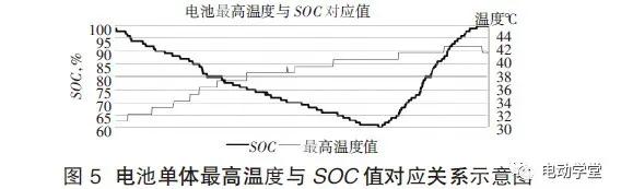 正在整车电池单体最高温度值弧线的根柢上,填补BMS反应的SOC变动弧线(运营下场后SOC充电至100%)如图5所示。由图5可看出道试期间由9:45(SOC为99%)至16:20(SOC为60%),电池单体最高温度正在2号箱(后置电池),温度为40℃。充电期间由16:20(SOC为60%)至17:40(SOC为100%),电池单体最高温度正在2号箱(后置电池),温度为42℃。