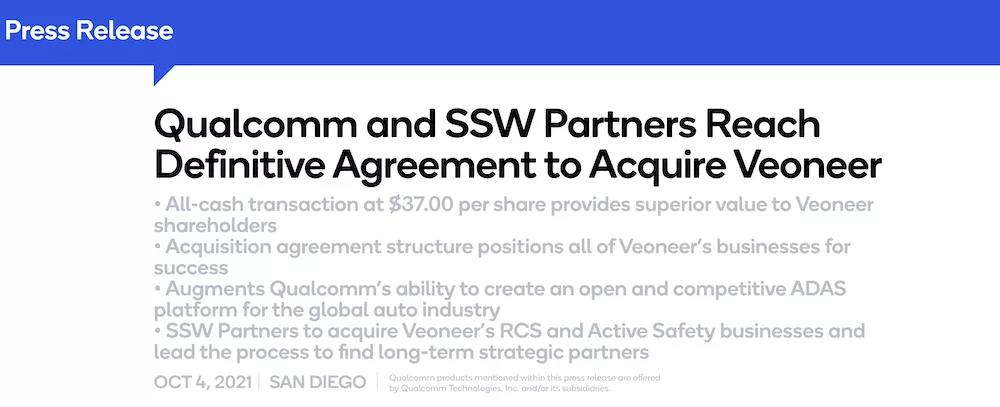 10月5日,高通布告与主动驾驶公司维宁尔实现了最终收购和讲,高通将与互助伙伴以45亿美元的价钱合伙收购维宁尔。高通的投资互助伙伴为SSW Partners,是一家位于