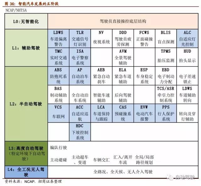国内将智能汽车的兴盛阶段分为 DA\PA\HA\FA 四阶段,国际智能汽车的阶段划分以美国高速公途办理局的划分 L0-L4 为主。目前只可汽车兴盛阶段处于 DA\PA 或是 L1\L2阶段。