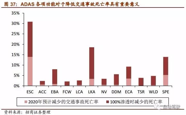 大幅删除交通事件发作率和亡故率。驾驶历程中 90%的失误是因为驾驶员的误操作导致, ADAS 体例可明显删除驾驶员误操作概率。依照 e- IMPACT 看待安设 ADAS体例后删除交通事件亡故率的估测,当 ESC 渗出率到达 100%时,可删除 30%事件亡故率,LKA(车道维持辅助)可删除 18%。