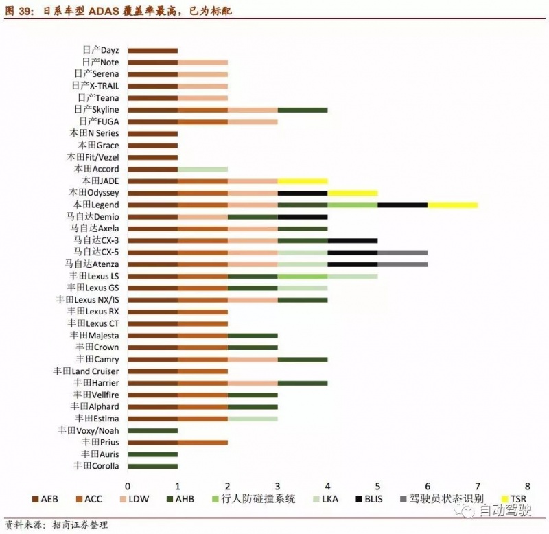 日系紧随其后,本田系效力最为富厚,丰田系遮盖车型最为完全。日系以丰田、本田、马自达、日产四大品牌为代表,遮盖主动重要刹车(AEB)、车道偏离预警(LDW)、主动远光灯(AHB) 、自适宜巡航(ACC) 、行人防碰撞、盲点辅助(BLIS) 、交通符号识别(TSR)、驾驶员形态识别、车道维持体例(LKA)共九个效力模块。此中本田系效力最为富厚,丰田系遮盖车型最为完全。