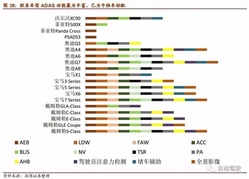 欧系车型:ADAS 效力最为富厚,兴盛最为成熟。欧系车辆以 ABB 为楷模代表,装置有主动重要刹车(AEB) 、车道偏离预警(LDW)、主动远光灯(AHB) 、碰撞预警(FCW)、自适宜巡航(ACC)、盲点辅助(BLIS)、堵车辅助、驾驶员属意力检测、夜视辅助(NV)、交通符号识别(TSR)、泊车辅助(PA)、全景影像共计 12 个 ADAS 效力。奥迪 A4、A6、Q7,宝马 3 系、5 系、 7 系、X6,飞驰 C 级、 E 级、 S 级均实行 8 项以上 ADAS 效力。