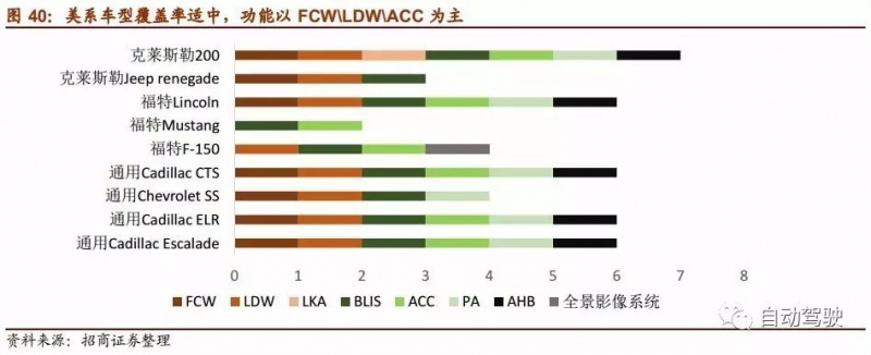 美系同欧日比拟遮盖率稍低,效力模块正在 5-6 个居众。美系以通用、福特、克莱斯勒为主,遮盖碰撞预警(FCW)、车道偏离预警(LDW)、车道维持体例 (LKA) 、主动远光灯(AHB)、自适宜巡航(ACC)、盲点辅助(BLIS)、泊车辅助(PA)、全景影像体例共八个模块。