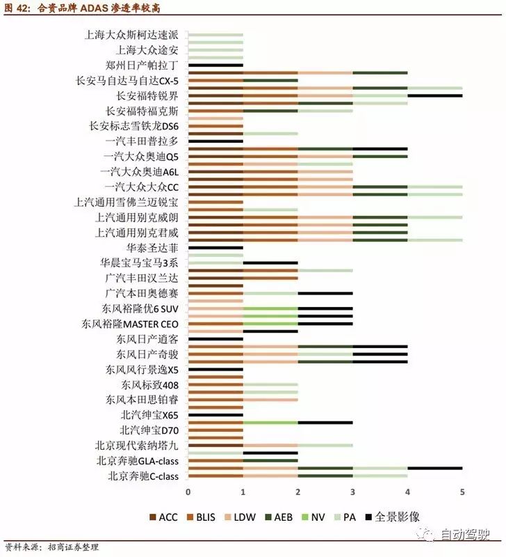 自决车型存正在必然滞后期,改日渗出率希望大幅抬高。目前而言,搭载 ADAS 体例高级模块看待自决品牌尚存正在性价比阻力,但跟着比亚迪汉、吉祥博瑞、广汽传祺等标杆车型装载 ADAS 体例,基本效力模块正在自决品牌市集希望进一步激勉。