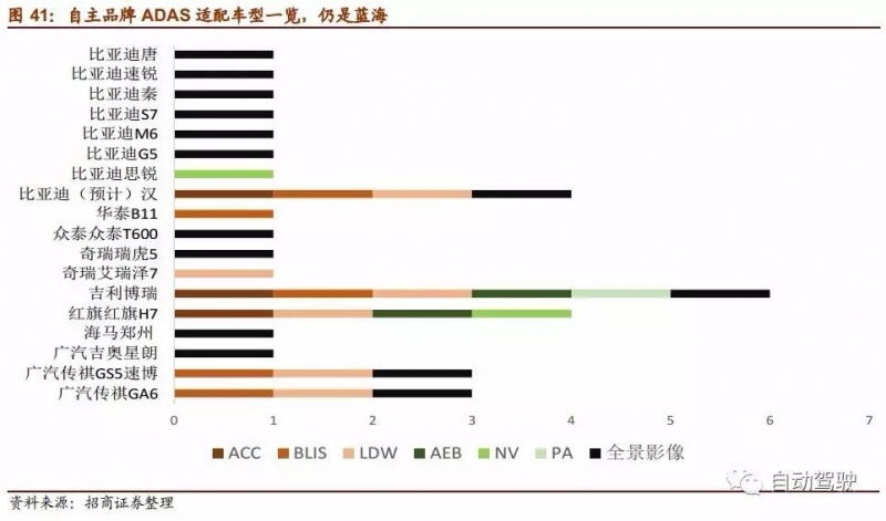 自决品牌仍是蓝海,极少数车型实行 ADAS 重要效力装置。自决品牌 ADAS 遮盖率极低,且以基本的全景影像为主。广汽传祺、红旗 H7、吉祥博瑞和即将面世的比亚迪“汉”是少数搭载 ADAS 中枢效力的自决车型。归纳来看,自决品牌市集仍有较大空间。