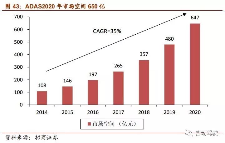 2020 年,国内辅助驾驶市集空间达 700 亿,CAGR 超 35%。正在中国筑筑 2025 中,国家策略磋议委员会对 2020 年辅助驾驶阶段渗出率落伍估量到达 50%(实情应逾越50%),连接Mobileye 一套 ADAS 预警体例的报价和改日五年的整车增速,估计 2020年辅助驾驶市集空间可达 700 亿。