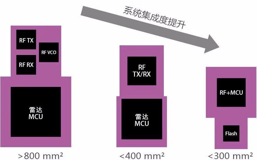 当今量产的76GHz~81GHz毫米波雷达芯片工夫多半采用SiGe制程,接纳通道、发射通道和本振通道离开告终。目前正正在向本钱更低、集成度更高的硅基CMOS工夫演进,从65nm、40nm渐渐向28nm、16nm工艺演进,同时集成度进一步抬高,告终射频前端、ADC、MCU和存储器单片全集成,如图所示,抵达本钱低、封装小、重量轻、功耗低的计划央求。车用毫米波雷达中枢芯片工夫开展趋向