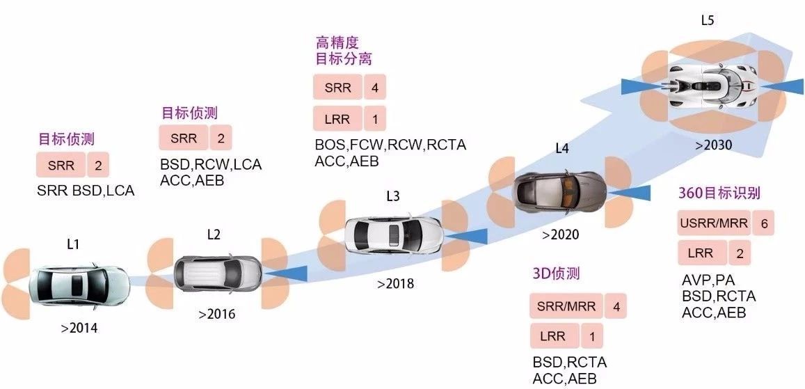 正在L1-L3级自愿驾驶中,毫米波雷达被用于倾向侦测和倾向离别,从而告终种种ADAS主动安适利用。正在L4-L5级自愿驾驶体系中搭载毫米波雷告竣像工夫。跟着自愿驾驶品级的抬高和众种主动安适利用的搭载,长距(LRR)、中距(MRR)、短距(SRR)车用毫米波雷达的安装数目会大幅擢升,并最终告终360度全笼罩化。