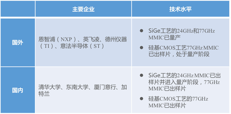芯片与海外工夫差异比拟大,国内众处于样片阶段。国内的车用毫米波雷达科研院所和芯片厂商,清华大学、加特兰已告终了硅基CMOS 76GHz~81GHz毫米波雷达全集成芯片的研发,东南大学、厦门意行等也推出了SiGe工艺的毫米波雷达芯片,均处于小批量坐蓐阶段,并将会渐渐告终量产并攻克国内市集。国表里芯片企业及工夫水准对照
