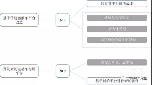 电动车计划: 1)Adapted Electric Vehicle Design (AEVD):基于旧平台计划,正在原有古代车平台上计划电动车,需求将就旧平台。 2)New Electric Vehicle Concept Design (NEVD):新计划,全新电动车计划,不必将就旧平台。依据AEP、NEP、NEVD、AEVD的组合能够取得三种电动汽车平台。个中1)旧平台-改制计划。闭键代表是美国福特公司,席卷同化电动车,插电式同化电动车、纯电动车,其余再有奥迪A e-tron,宝马Mini-e等;2)旧平台-新计划。代表有Leaf纯电动,丰田普瑞斯,通用Bolt;3)新平台-新计划。代表闭键是特斯拉和宝马i3、i8。从新平台-新计划到旧平台-改制计划,电车平台跟燃油车平台能够共用的水平越来越高。