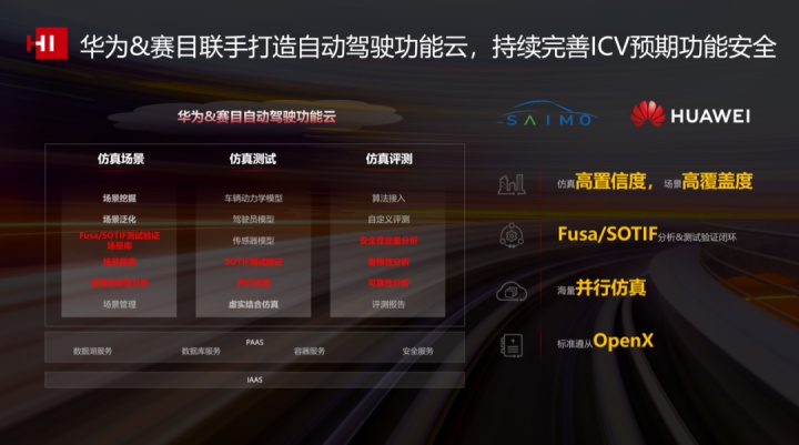 正在本年4月20日,华为与赛目科技正式签定计谋配合契约,两边结成深度的配合伙伴相干,正在智能网联汽车仿真器械链、测试验证方式、车载操作体系和车载智能谋略平台的测评系统以及闭连规范模范方面展开磋商与配合。时隔半年,华为与赛目科技基于云谋略、仿真测试、场景数据、预期成效太平等界限的本领积聚,以及对自愿驾驶本领斥地与验证的深切认识,笼络打制了自愿驾驶成效云平台,面向行业供应高质地和高效力的预期成效太平判辨、仿真试验、验证评议的任职才力。