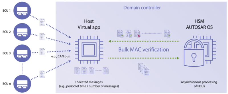 这带来了强大的机能晋升。 假设主机和HSM之间的每次数据传输仅花费10us,看待100条信息,延迟合计也高达1 ms = 10us * 100,这给及时体例带来了寻事。运用批量MAC接口,能够正在百分之一的时候内解决这100条信息。看待运用车辆筹算机和域支配器创筑收集并正在此历程中界说了很众PDU的主机厂而言,批量MAC接口具有明明的上风。通过确保对豪爽分歧信息的足够疾速的身份验证,它能够正在车载收集中支撑安适的及时通讯。鄙人一代HSM软件中,仍旧集成了批量MAC。