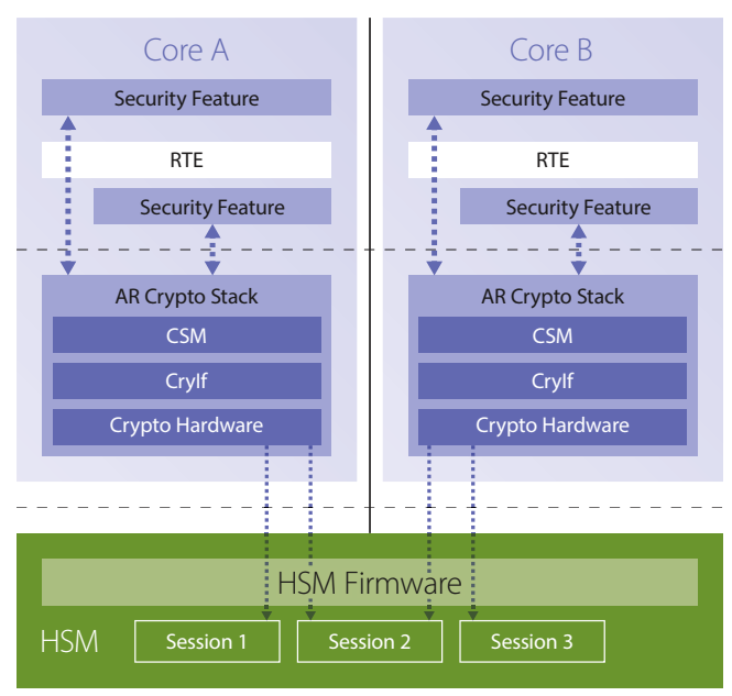 假如将软件运用措施和ECU性能组合正在车辆筹算机上,则能够预念,有时会有很众运用措施同时移用HSM的安适性能。正在这种状况下,HSM必需供应需要的安适性能,并及时办理众个运用措施的数据流。这将来到准则HSM的极限,以至抢先纯软件安适处置计划的极限众。然而,具有及时操作体例和智能、精巧的会话观念的新一代HSM能够竣工职责。