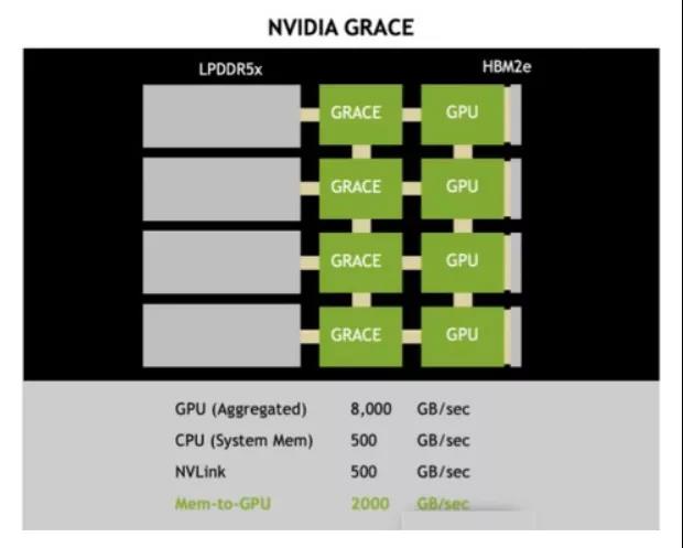 为了杀青此架构,英伟达不才一代Arm中央时间之上构修了专属的Grace CPU,与具有LPDDR5x内存撑持的GPU以及GPU模块上的HBM2e内存一块,可能以高达900GB / s的速率撑持高速NVIDIA NVlink互连,来消逝最纷乱的巨型模子AI和HPC行使序次的瓶颈。NVIDIA声称,采用Grace时间的体系将使其模糊量比此刻运转正在X86 CPU上的高端古板DGX AI超等筹划机体系速10倍。